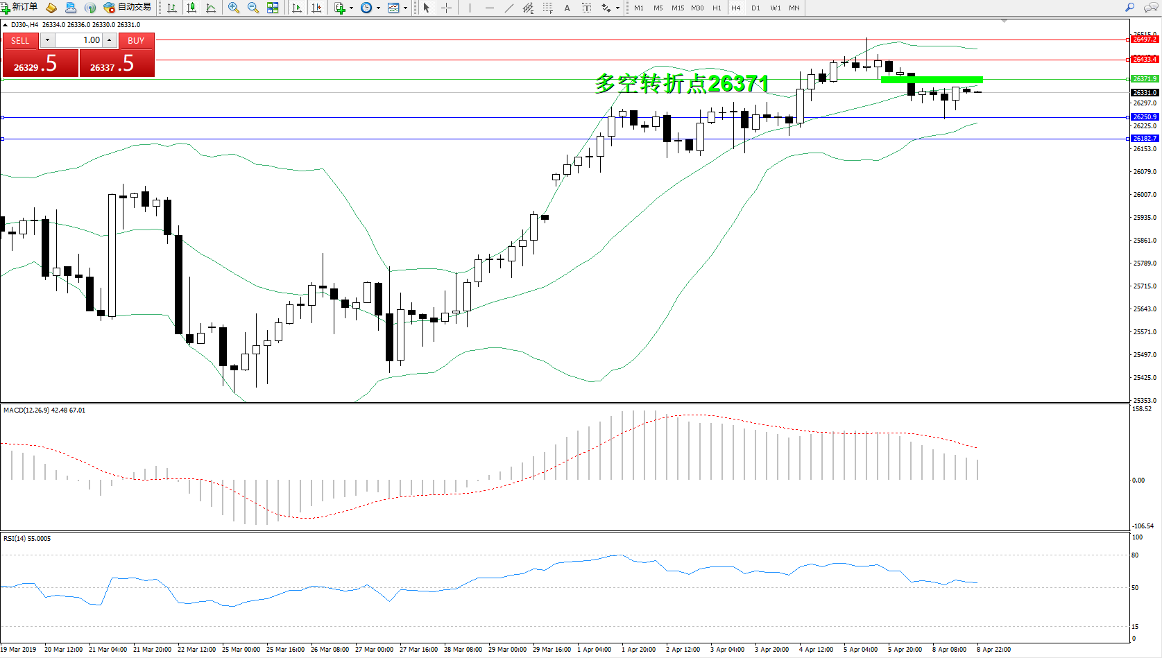 道琼斯指数DJ30—— 4小时K线图显示: