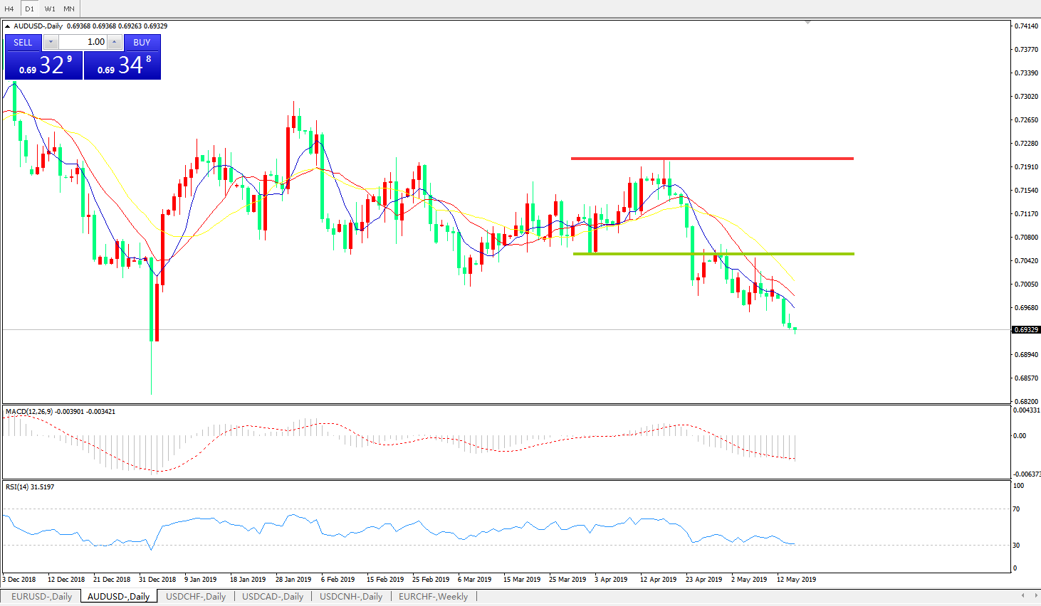 技术面简析:日图均线有序空头排列看跌汇价持续走低MACD下穿0轴且动能柱0轴下方放量,RSI缓步走低预计汇价将进一步下行