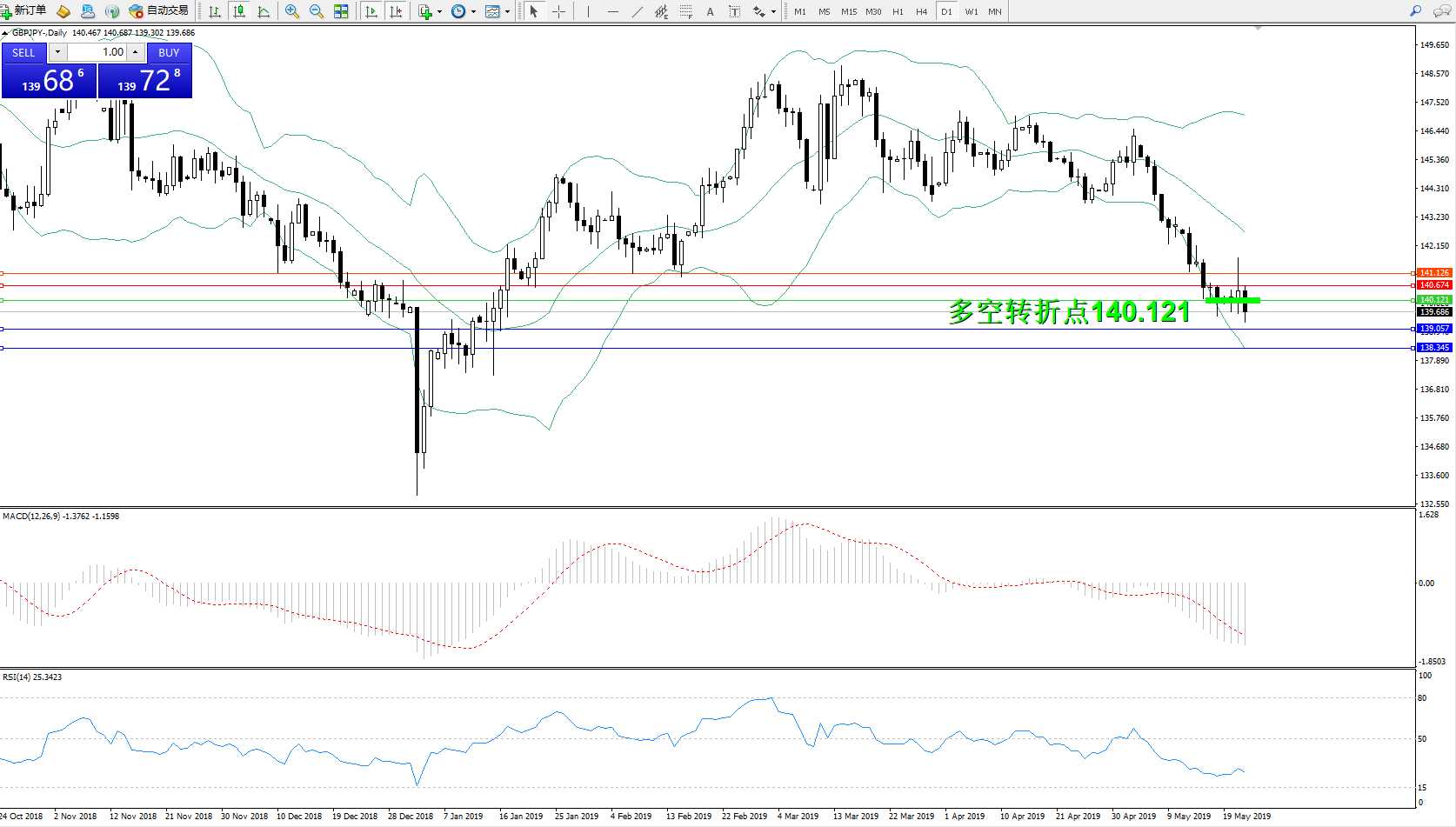 交易策略:140.121下方看跌,目标139.057、138.345