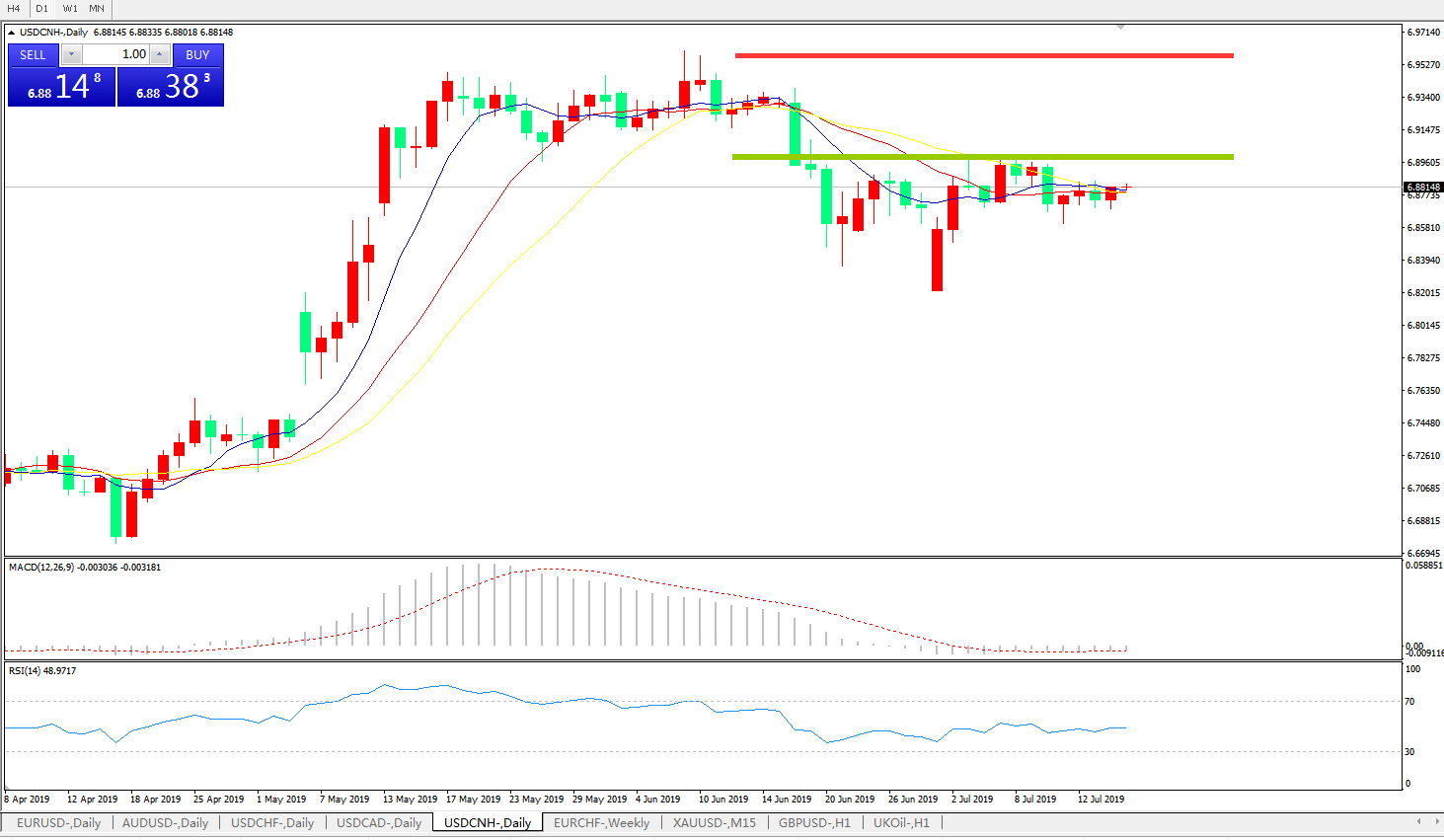 技术面简析:日图均线继续粘合无方向,MACD徘徊在0轴附近且动能柱若隐若现,RSI趋于走平,预计短期汇价将继续整理或向下修正,中期关注6.90附近多空转折区域压制是否有效及中美贸易谈判最新进展。