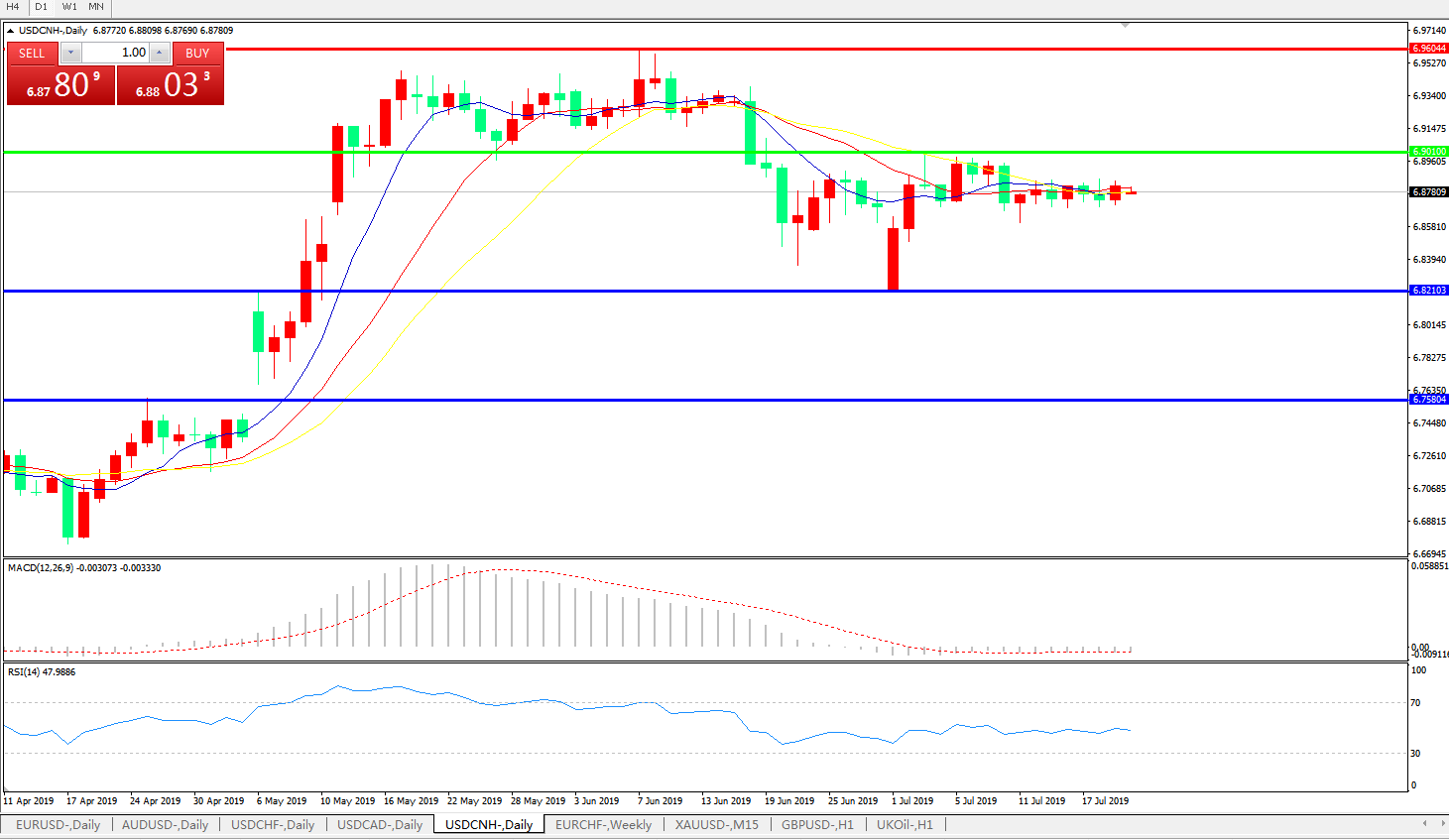交易策略: 在6.9010之下,看跌,目标价位为6.8210,然后为6.7580。