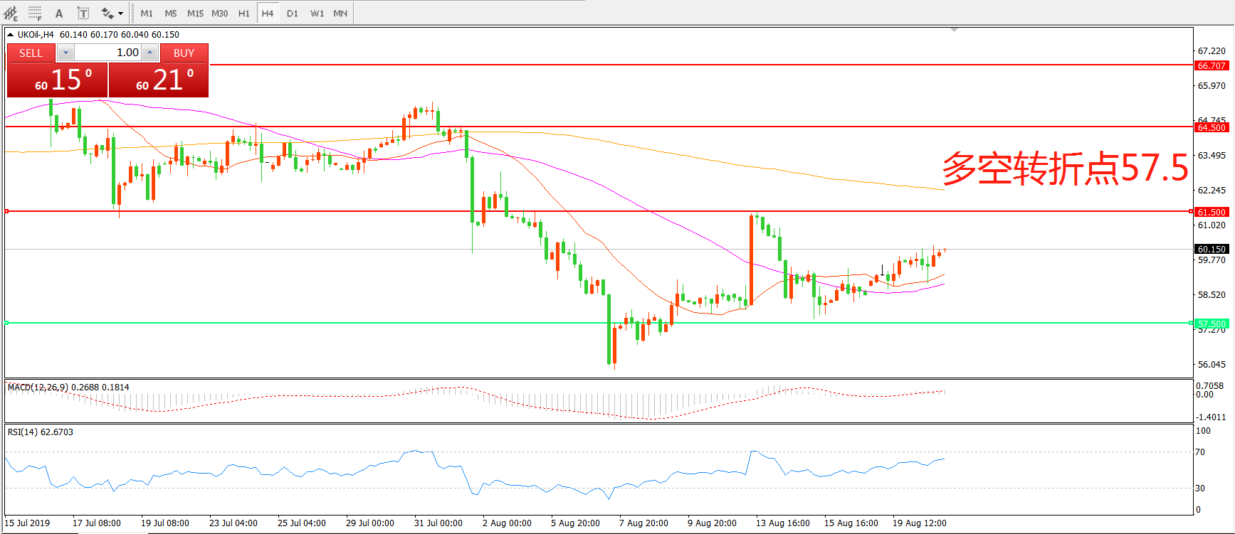 北京时间8月21日凌晨,美国石油协会(API)公布的数据显示,美国截至8月16日当周API原油库存减少345万桶,降幅超过预期的188.5万桶,利好油价,加上市场乐观地认为全球贸易紧张局势将会缓和,且憧憬主要经济体将采取刺激措施以防止潜在的经济放缓,布伦特原油小幅反弹,最终收报60.07美元/桶。晚间22:30将公布EIA库存数据,务必重点关注。