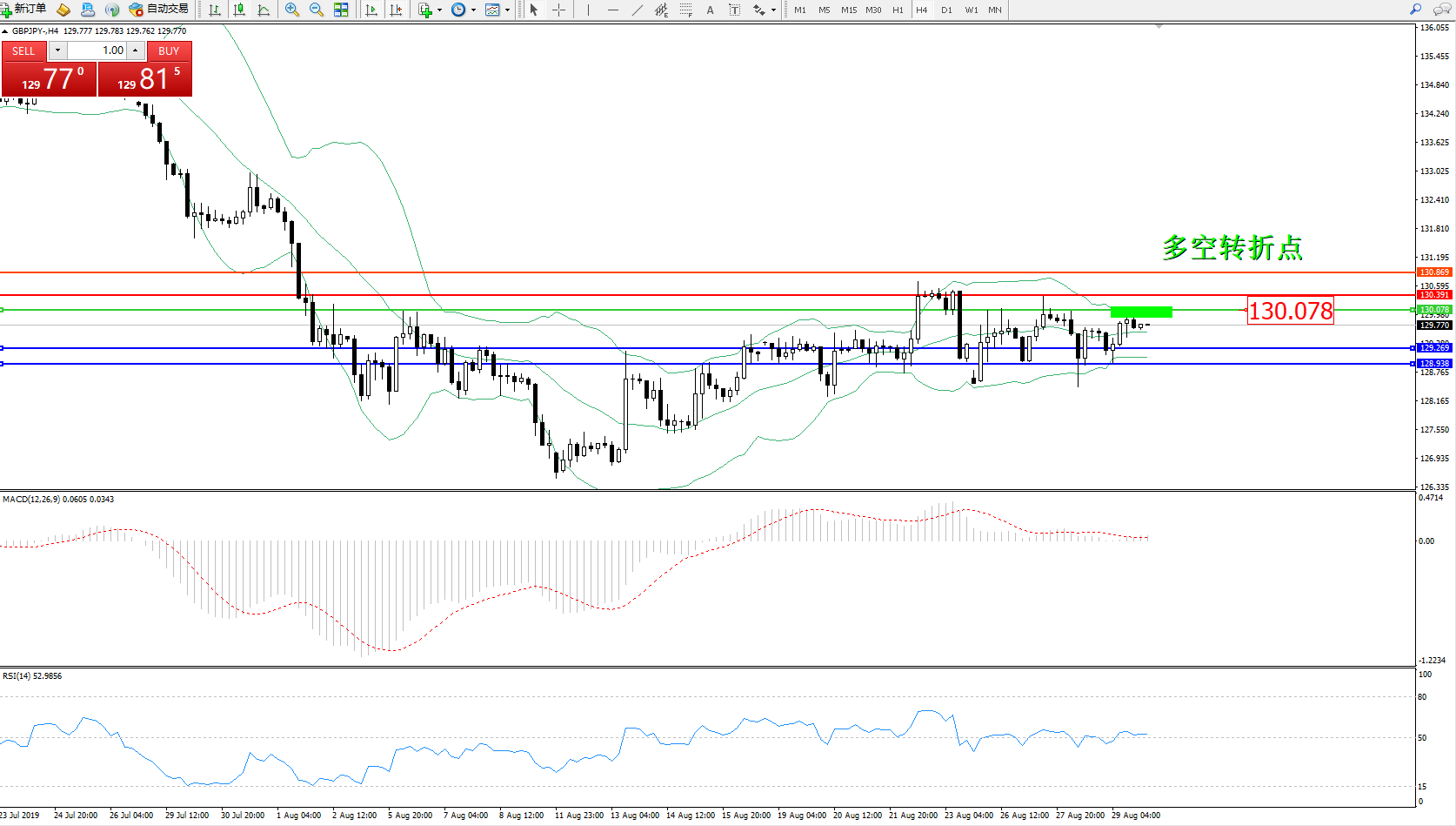 交易策略:130.078下方看跌,目标129.269128.938