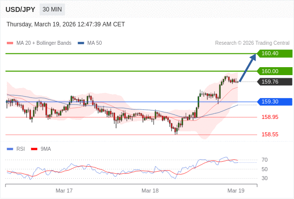 在 159.30 之上,看涨,目标价位为 160.00 ,然后为 160.40 。