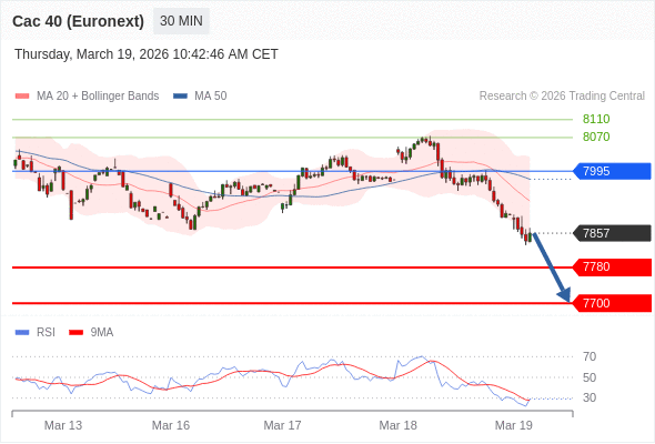 法国CAC指数期货 (Euronext) (J6) 当日内: 存在压力。