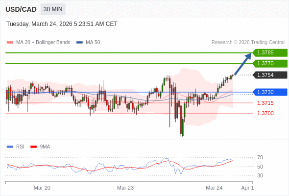 在 1.3730 之上,看涨,目标价位为 1.3770 ,然后为 1.3785 。
