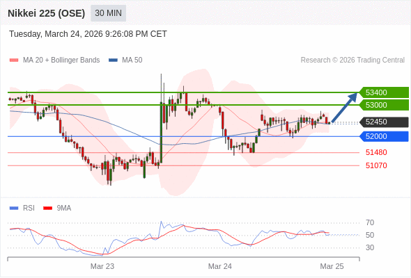 日经225股指期货 (OSE) 当日内: 超短线(当日内)支撑位在52000附近。
