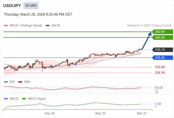 美元/日元 当日内 : 看涨,当 159.26 为支撑位。