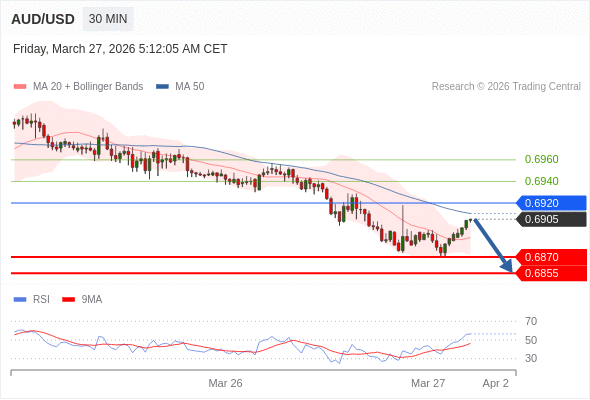 澳元/美元 当日内: 短期关键阻力位在0.6920。