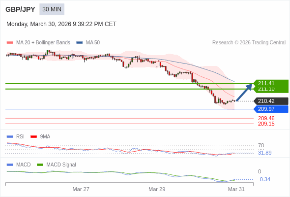 英镑/日元 当日内 : 有上涨的可能,目标价位定在 211.41 。