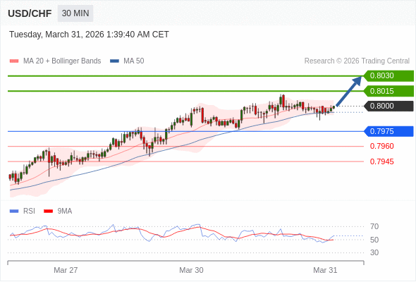 在 0.7975 之上,看涨,目标价位为 0.8015 ,然后为 0.8030 。