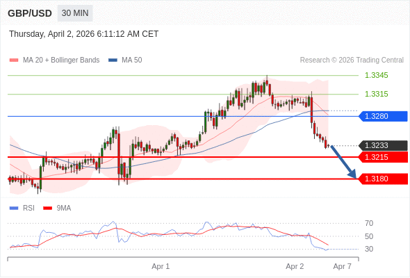 交易策略: 在 1.3280 之下,看跌,目标价位为 1.3215 ,然后为 1.3180 。