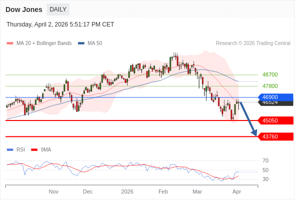 在 46900 之下,看跌,目标价位为 45050 ,然后为 43760 。