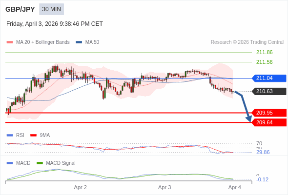 英镑/日元 当日内 : 看跌,在 211.04 之下。