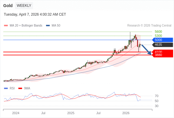 在 5000 之下,看跌,目标价位为 4100 ,然后为 3880 。