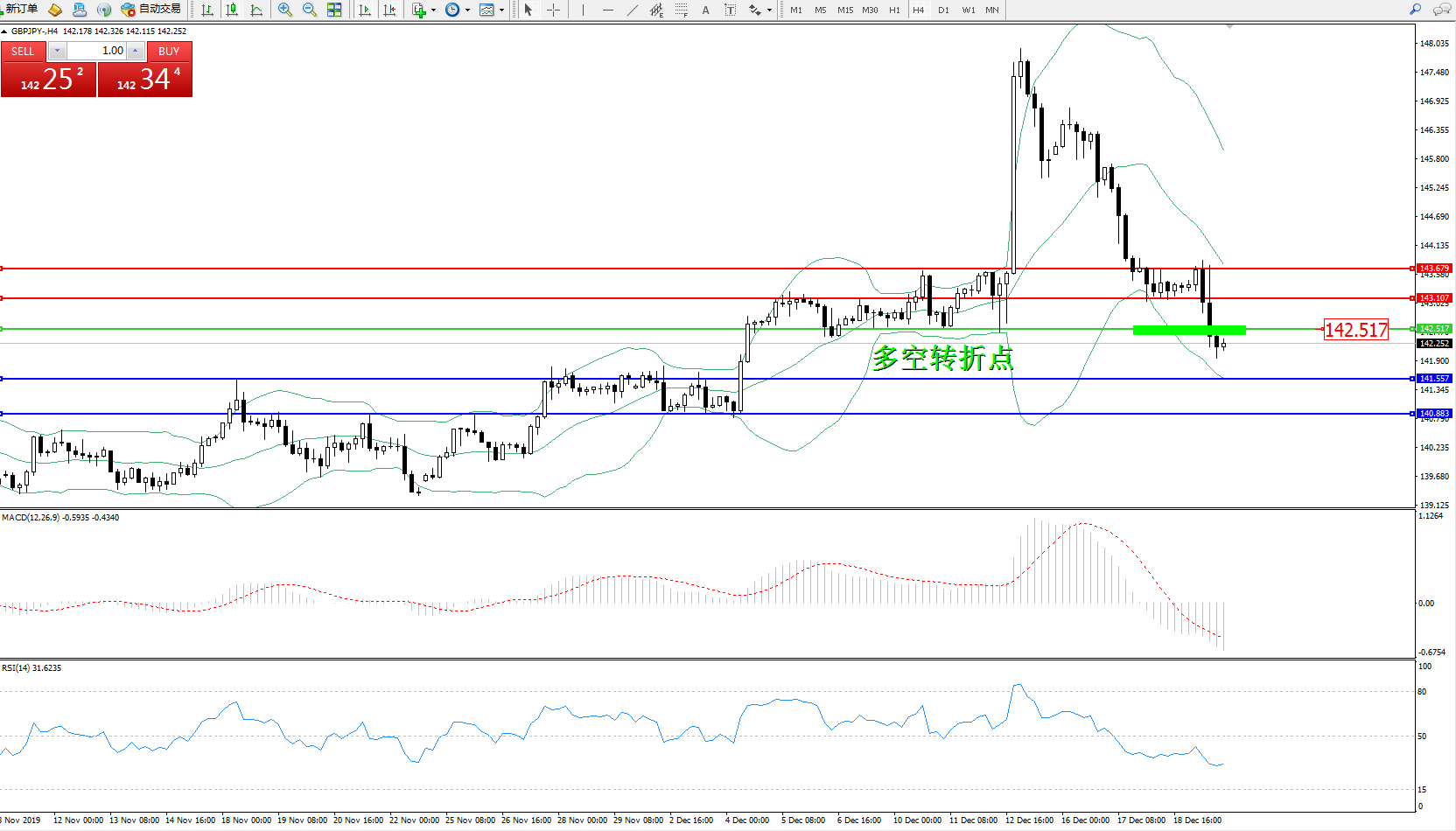 交易策略:142.517下方看跌,目标141.557140.883