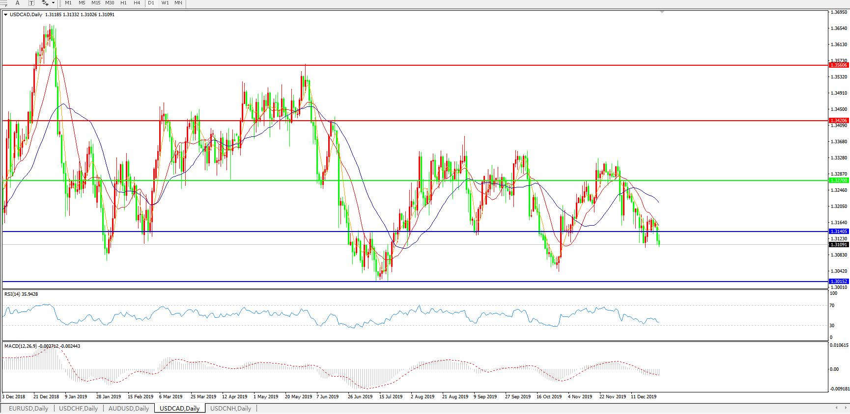 技术面简析:日线图均线呈空头排列,汇价在1.3140关口整理后再度下行,MACD运行于0轴下方且量能0轴下方微放量,RSI震荡走低,预计汇价将进一步下行空间。