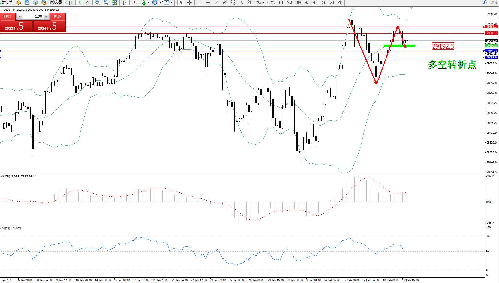 道琼斯指数DJ30—— 4小时K线图显示: