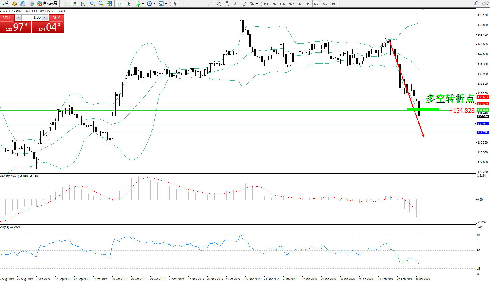 交易策略:134.828下方看跌,目标132.921、131.718