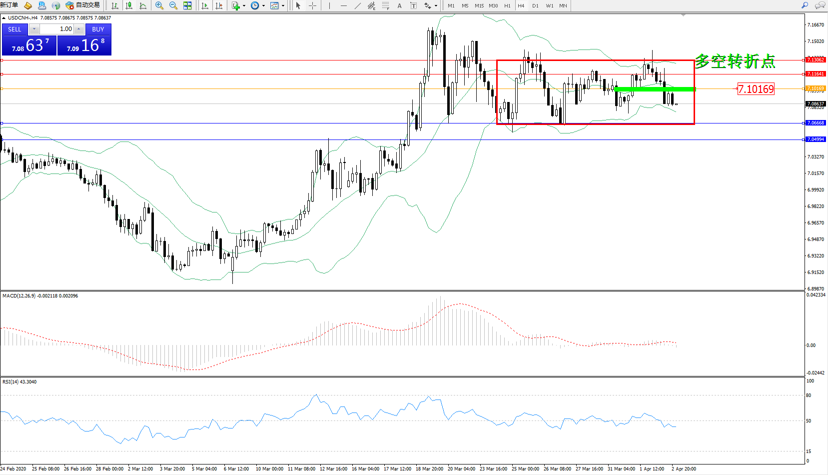 交易策略:7.10169下方看跌,目标7.06668、7.04994