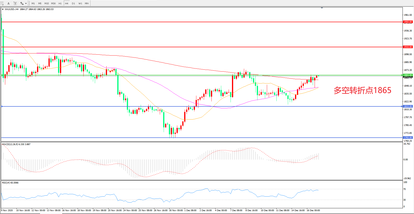 4小时图看,金价自低位连续拉升,整体表现十分强势,200周期均线被顺势突破,1865成为多空分水岭,MACD红柱增加,RSI指标走平,日内延续上行概率较大。