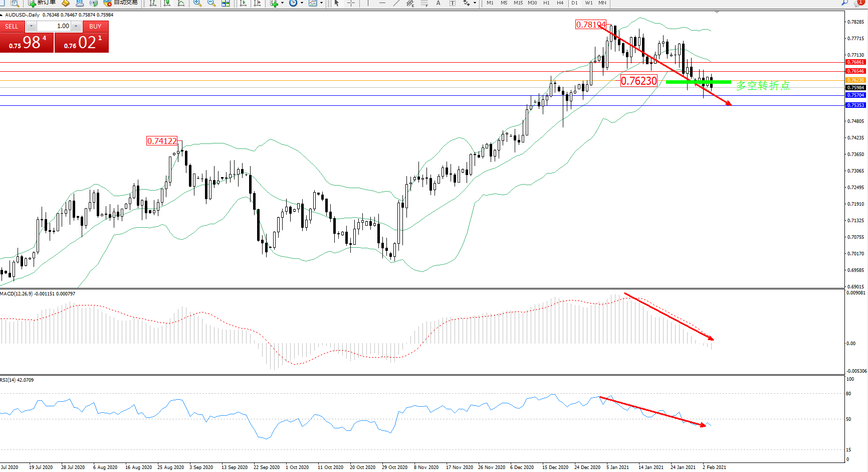 交易策略:0.76230下方看跌,目标0.75704、0.75353