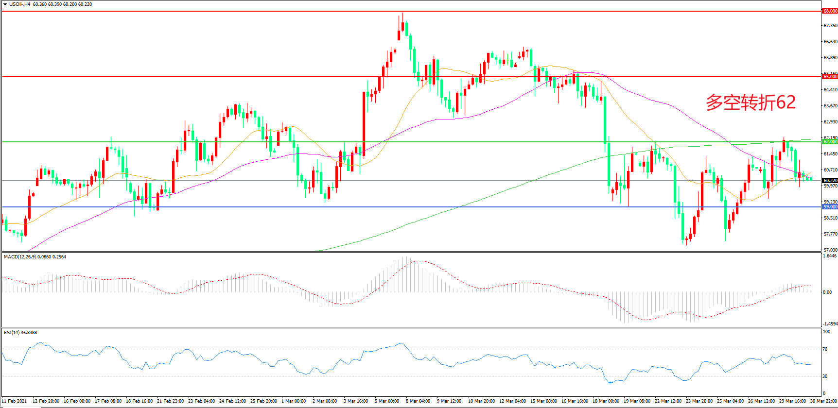 4小时图看,油价触碰62美元后再度回落,短期走势陷入震荡,62美元成为上方阻力,59美元形成下方支撑,MACD红柱缩短,RSI指标走平,日内延续震荡概率较大。