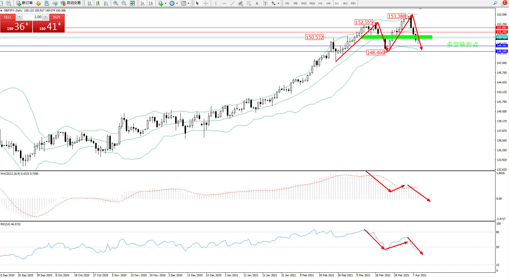 交易策略:150.532下方看跌,目标149.342、148.588