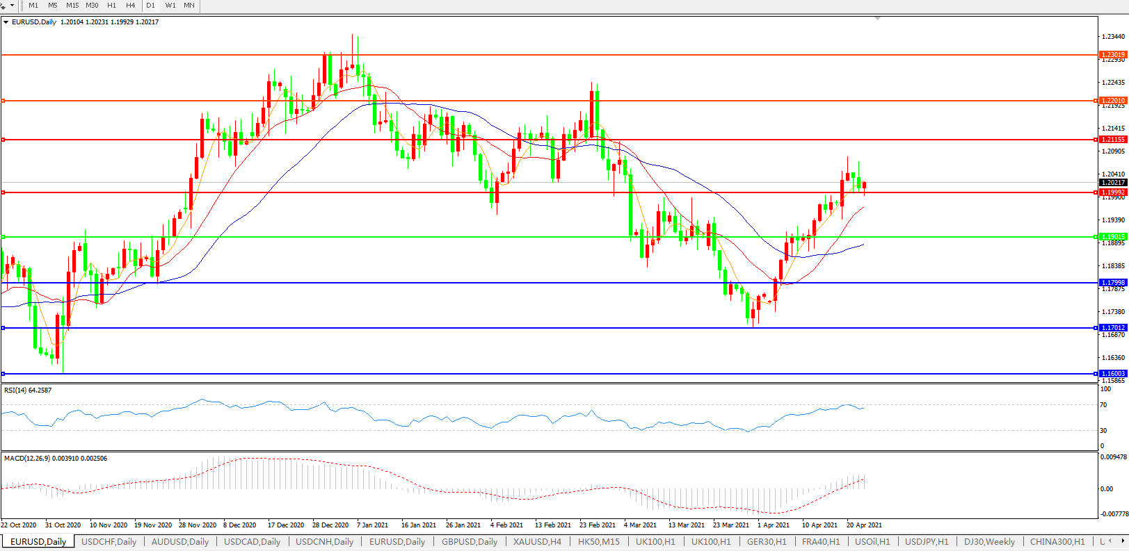 技术面简析:日图均线呈多头排列,汇价上行遭遇压力回踩持续整理,MACD上穿0轴且量能有小幅放量迹象,RSI小幅走弱,预计短期汇价大概率在整理后进一步上行。