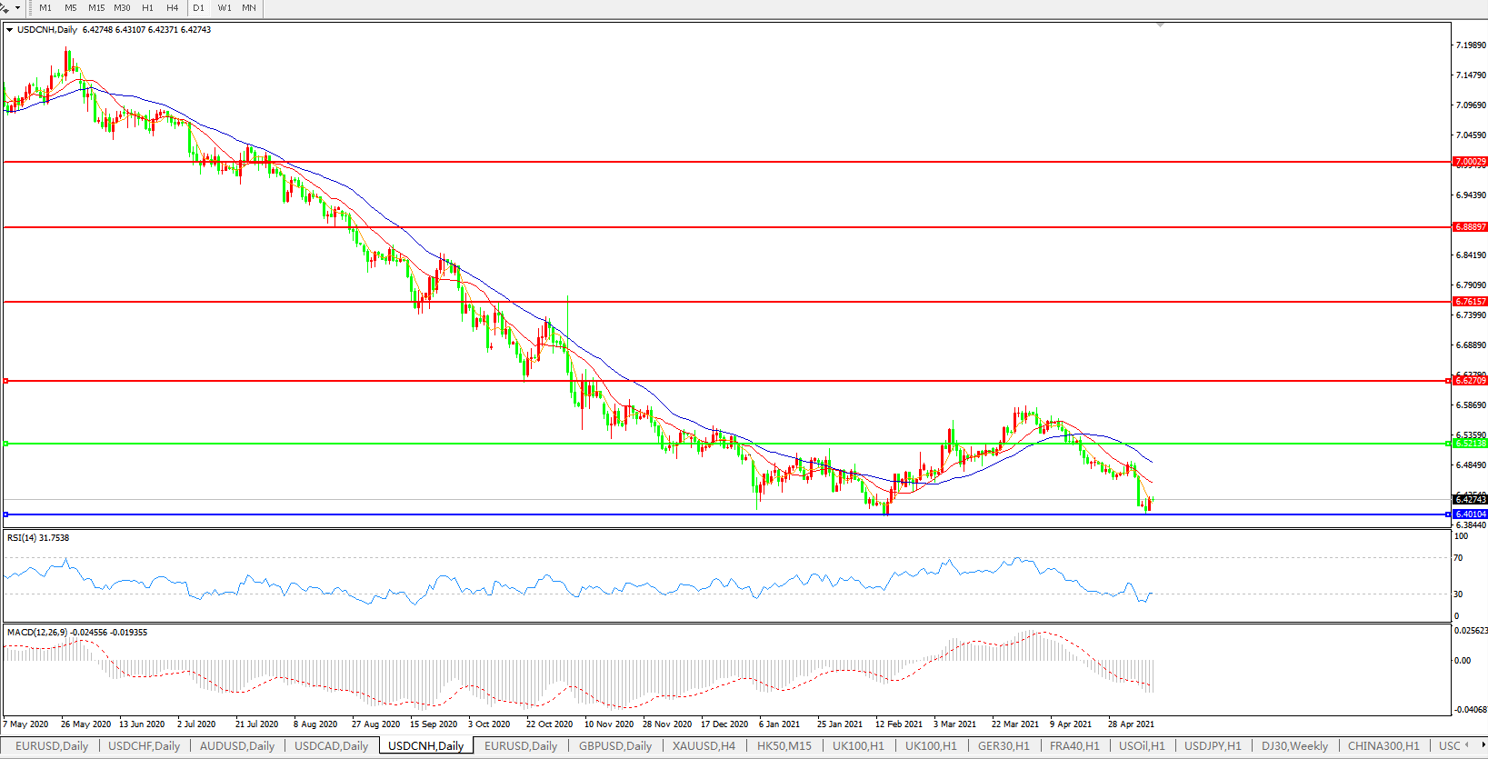 美元兑人民币USDCNH 日线图: