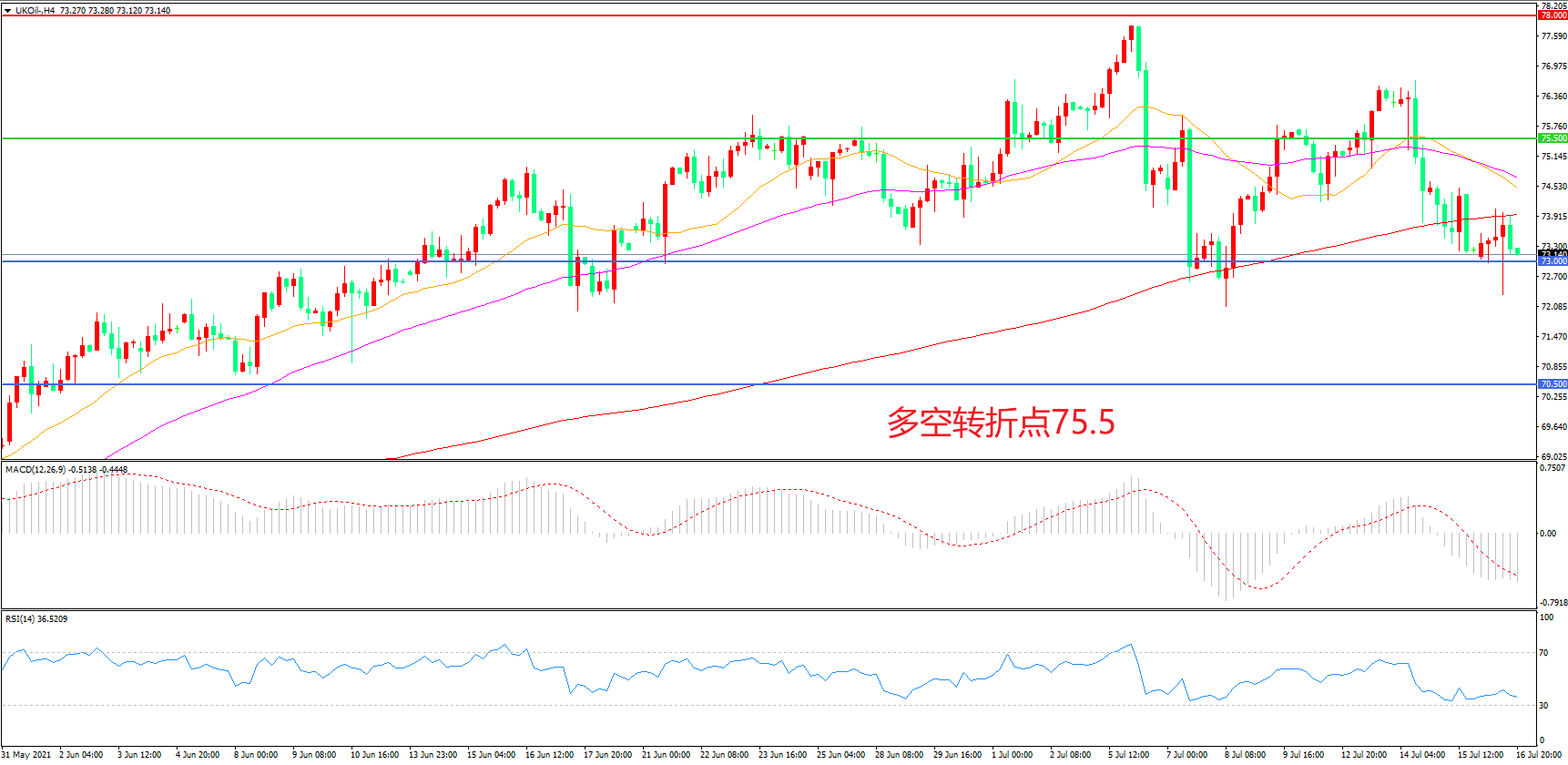 交易策略:在75.50之下看跌,目标73.00                70.50