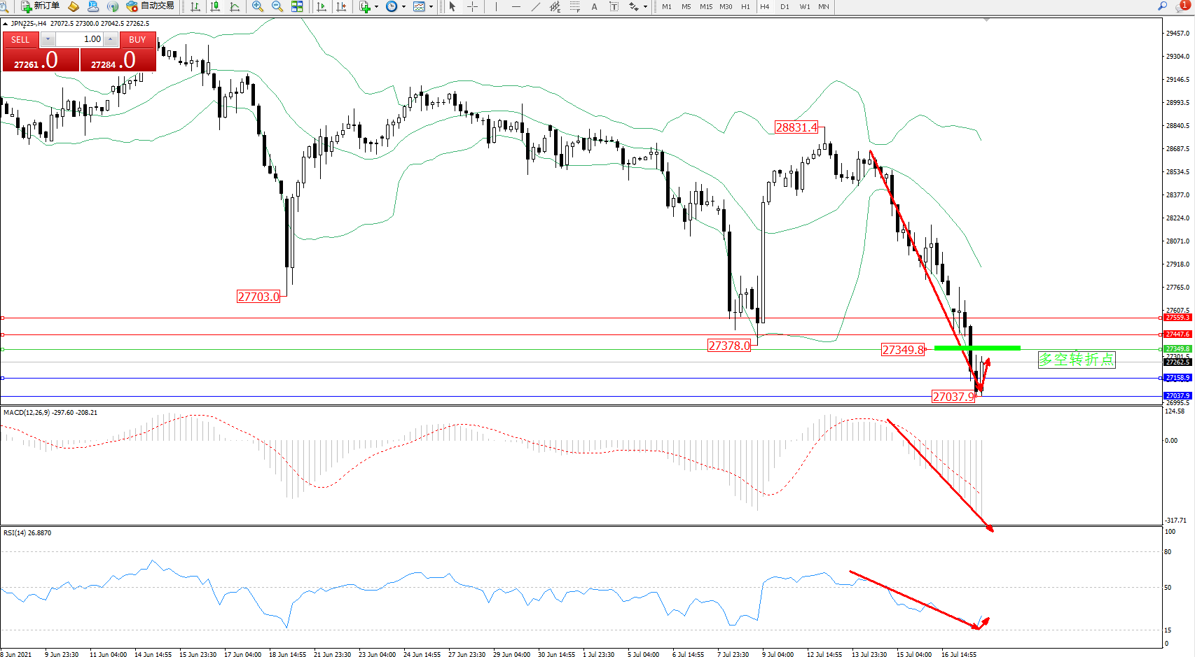 技术点评:空头动力延续布林带指标下轨附近持续震荡下行,低位抵达27037位置后短暂支撑反转整理中,短暂多头动力并不强劲,布林带指标呈下行趋势走势良好,且呈扩大波幅走势中,虽有短暂收口迹象,但未能改变下行趋势,MACD指标处于空头区域持续震荡向下移动中,RSI指标处于空头区域持续震荡下行,低位触及超卖区15均衡线后开始弱势反转整理;
