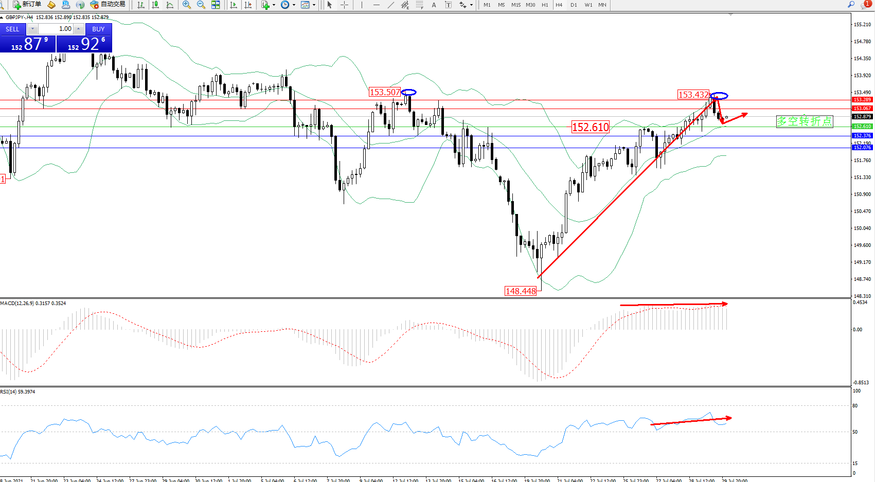 交易策略:152.610上方看涨,目标153.067、153.289