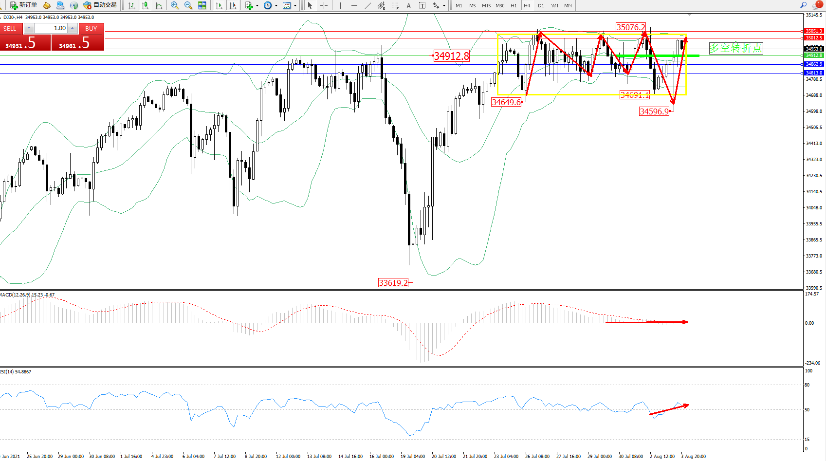 道琼斯指数DJ30——4小时K线图显示: