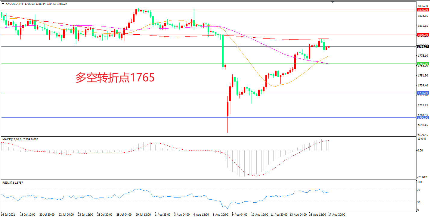 4小时图看,金价暂时受阻于200周期均线,但短线反弹趋势依然完好,21周期均线成为下方支撑,1800成为上方阻力,MACD红柱缩短,RSI指标走平,日内震荡上行较大。
