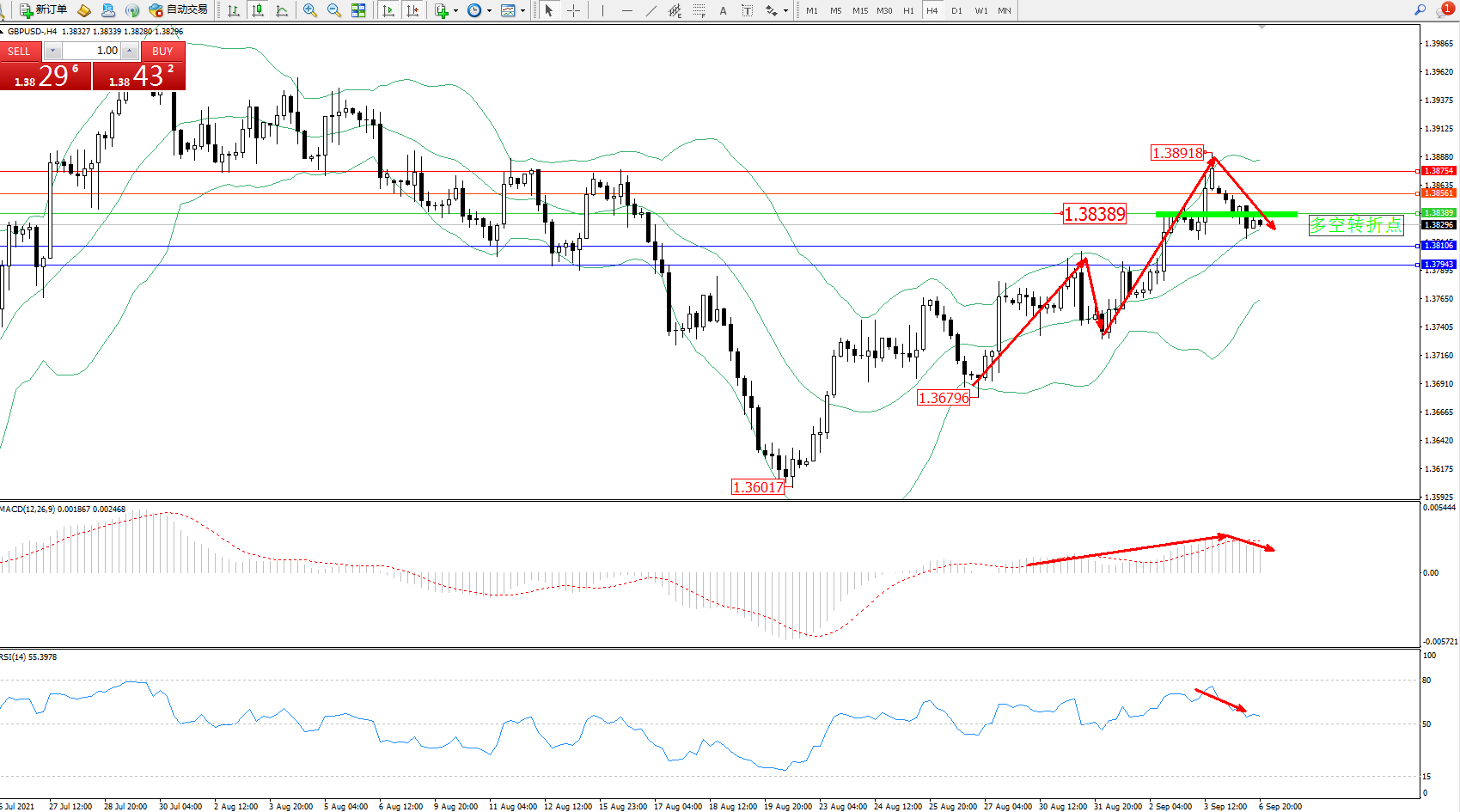 交易策略:1.38389下方看跌,目标1.38106、1.37943