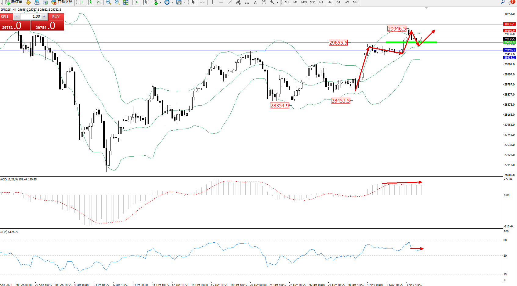 日经指数JPN225——4小时K线图显示:
