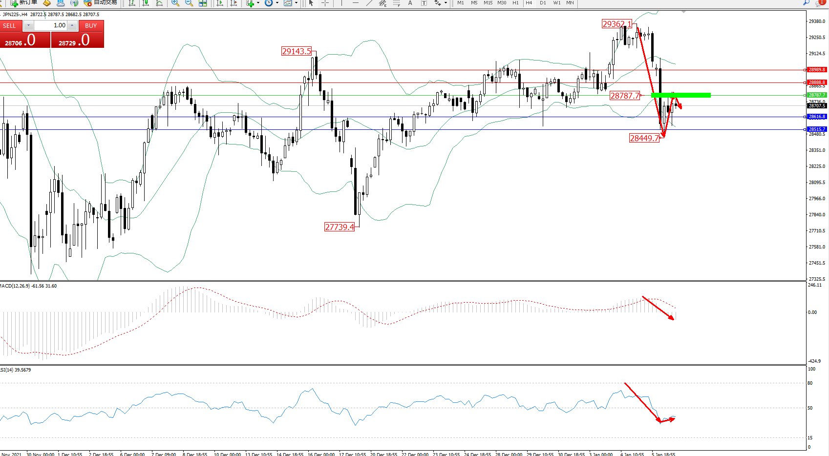 日经指数JPN225——4小时K线图显示: