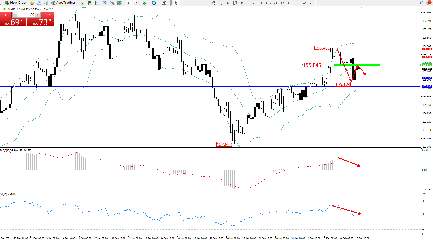 交易策略:155.845下方看跌,目标155.352、155.038