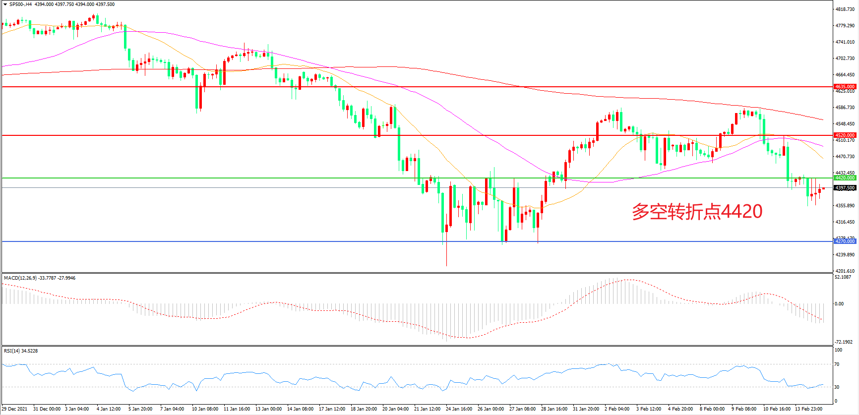 周一(2月14日),市场聚焦美联储3月加息动态和俄乌地缘政治局势进展,多空博弈较为克制,标普500延续震荡形态,收报4934点。拜登和普京周末的外交努力未能取得突破,美股因即将爆发战争的可能性而下跌,随后普京支持继续与西方会谈,市场恐慌情绪有所缓解,但地缘政治的阴云依然未能消散,美股延续低迷概率较大。