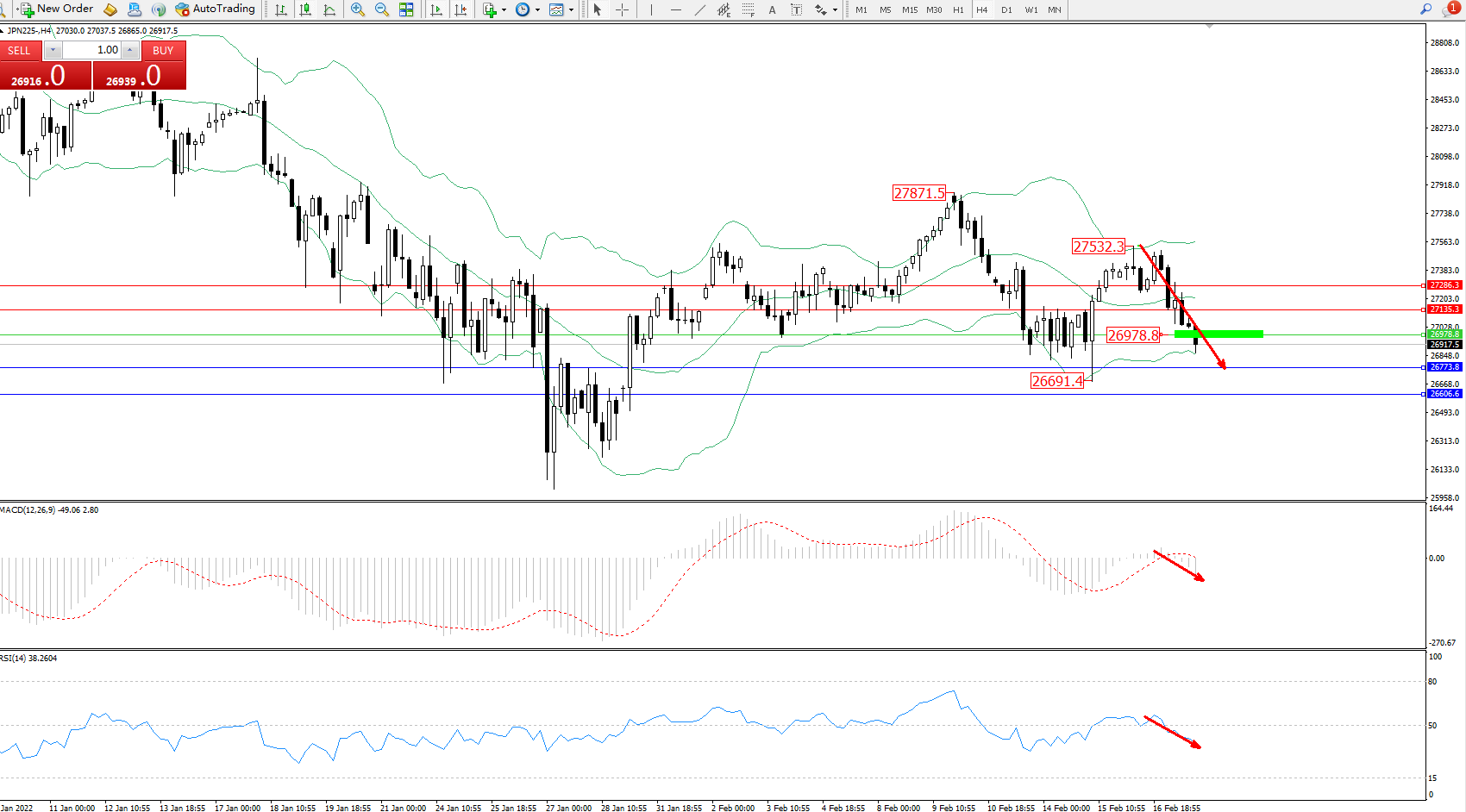 日经指数JPN225——4小时K线图显示: