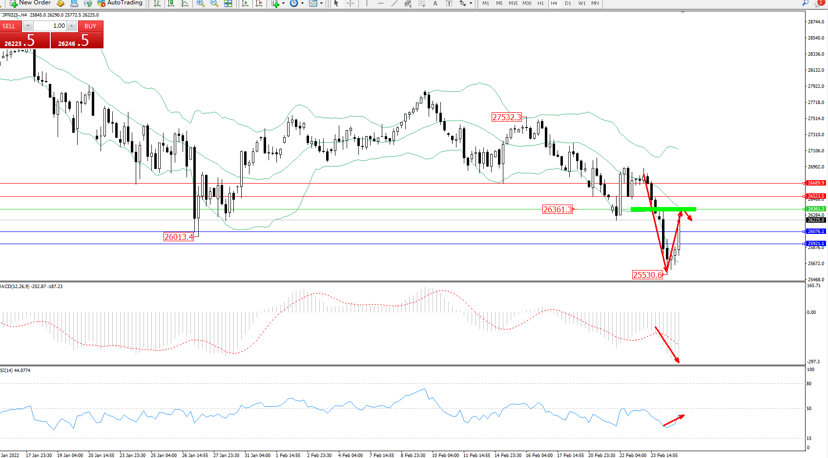 日经指数JPN225——4小时K线图显示: