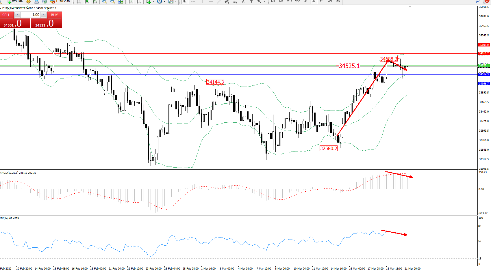 交易策略:34525下方看跌,目标34314、34096