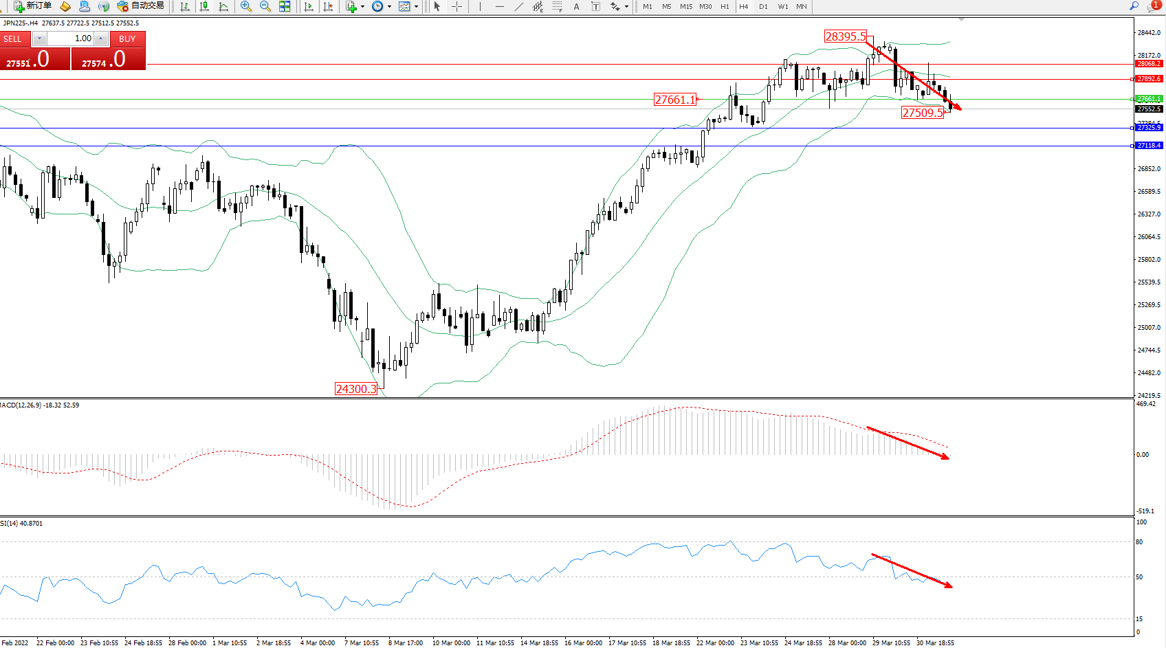 日经指数JPN225——4小时K线图显示: