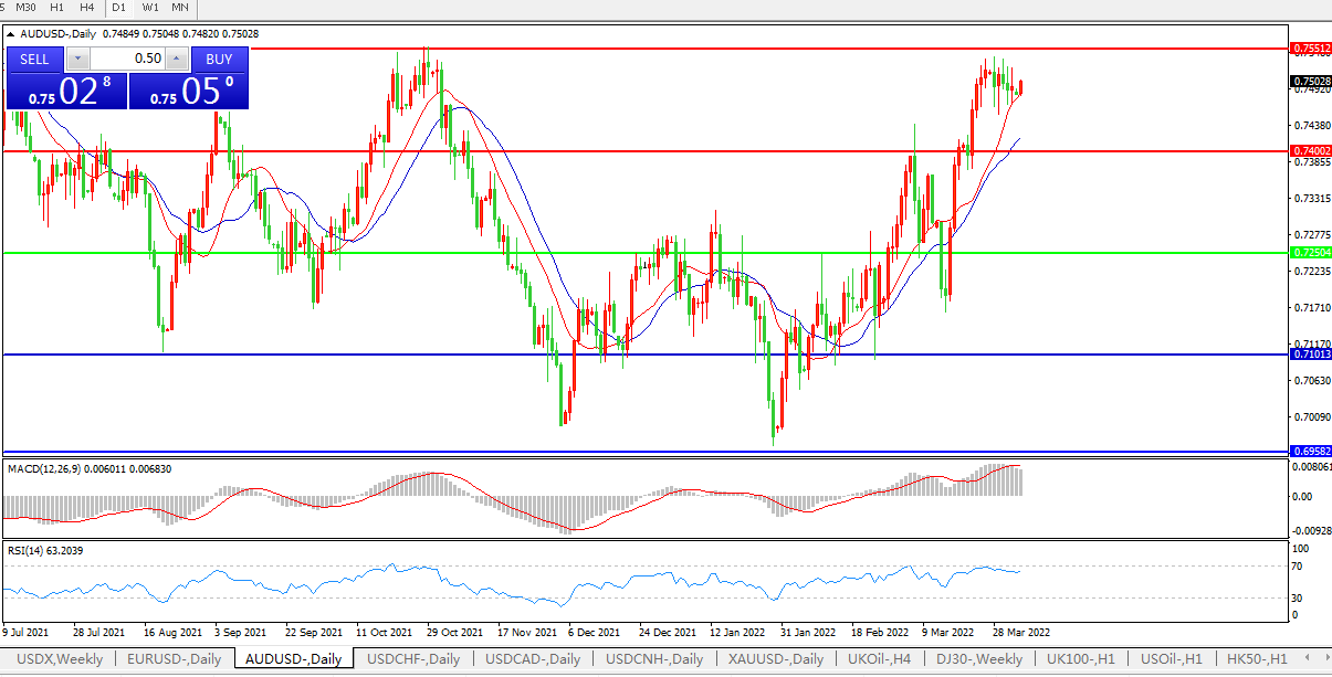 技术面简析:日图均线呈多头排列,汇价回落整理后小幅上攻,MACD运行于0轴上且量能小幅缩量,RSI小幅走弱,预计汇价大概率将在整理后进一步上行。