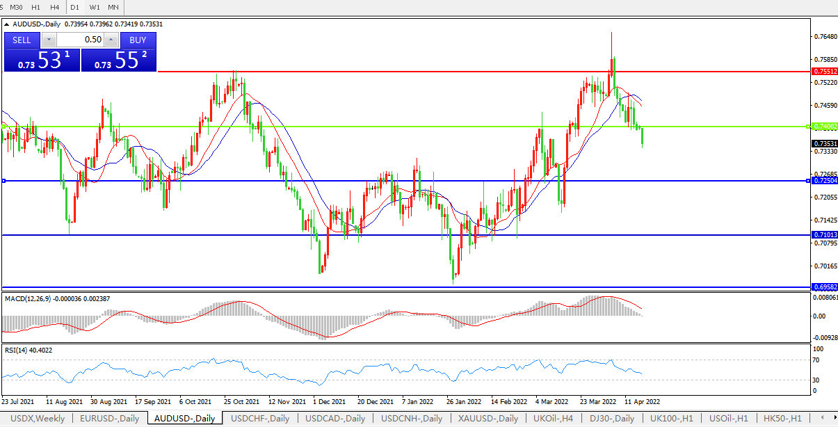 交易策略:0.7400下方看跌,目标0.7250、0.7100