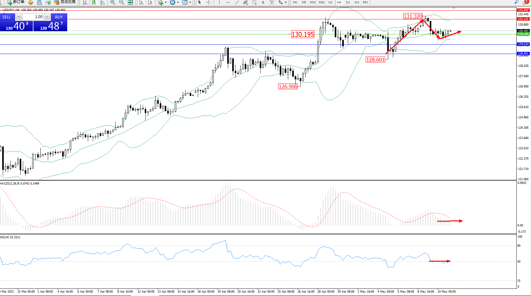 交易策略:130.195上方看涨,目标131.141、131.692