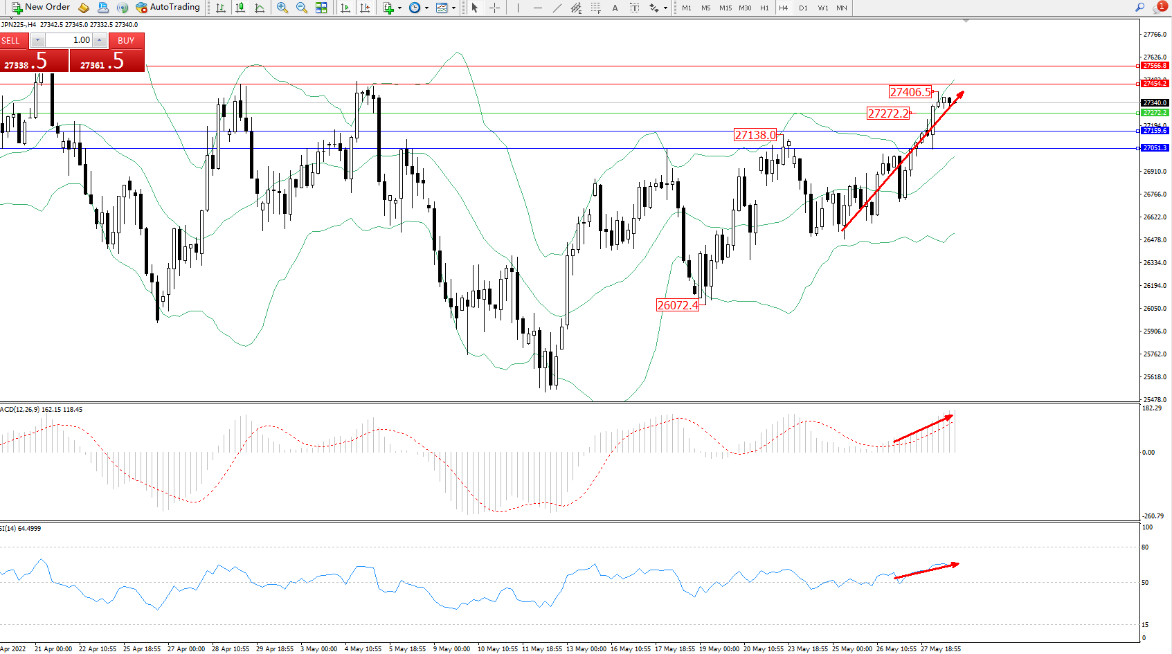 日经指数JPN225——4小时K线图显示: