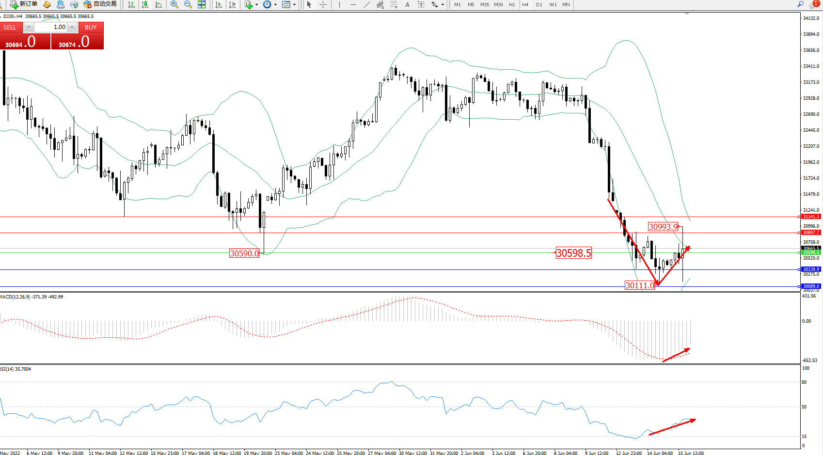 道琼斯指数DJ30——4小时K线图显示: