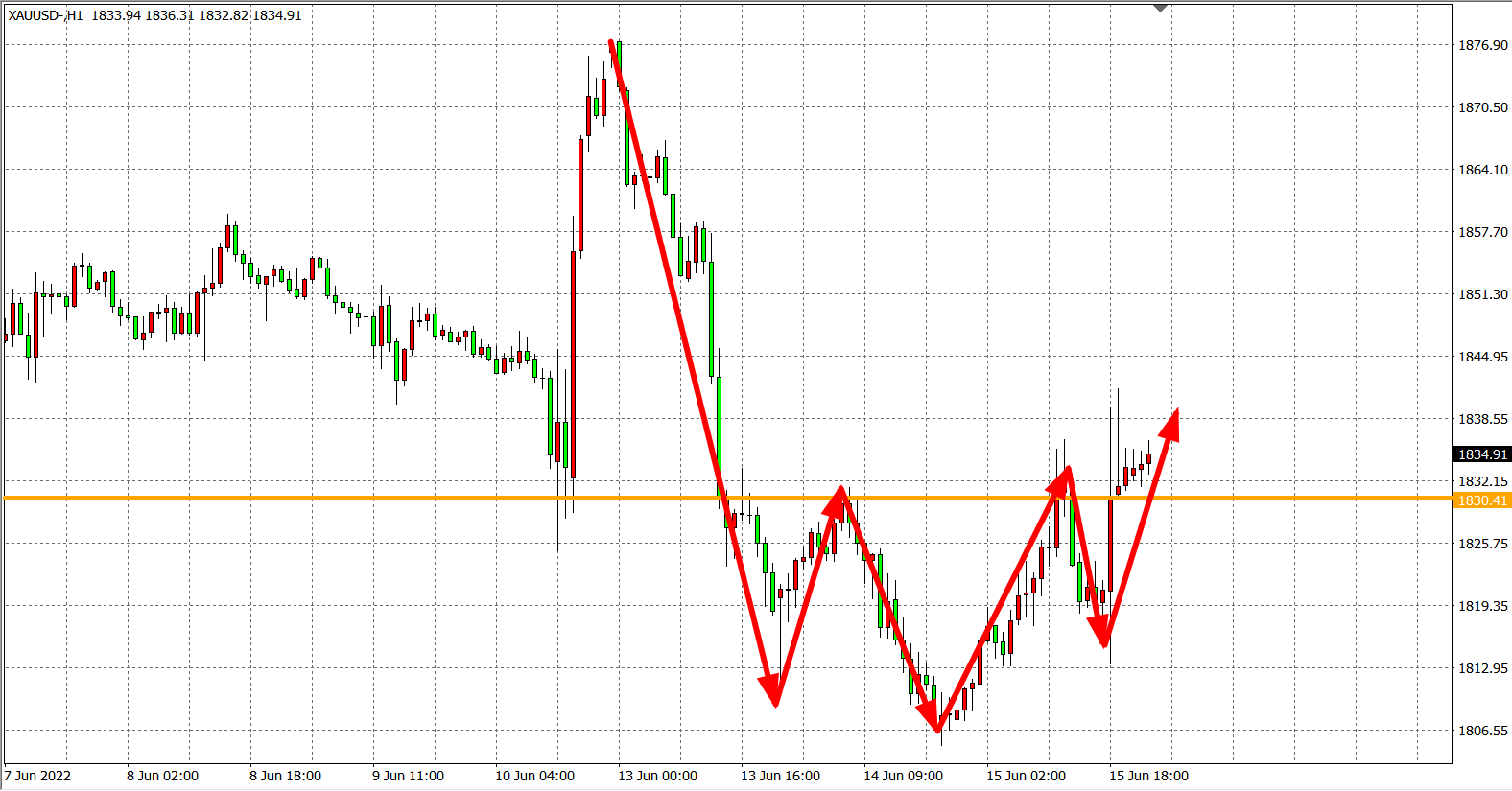 周三(6月14日)美联储公布最新利率决议,将基准利率上调75个基点,并坚决承诺将通胀率恢复到2%。随后鲍威尔讲话表态大幅加息不会常态化,下次可能加息再降低至50个基点,该言论为美联储激进加息举措降温,被市场解读为“鸽派”,美指高位回落,黄金大幅反弹,最终收涨1.43%,报1833.9美元/盎司。